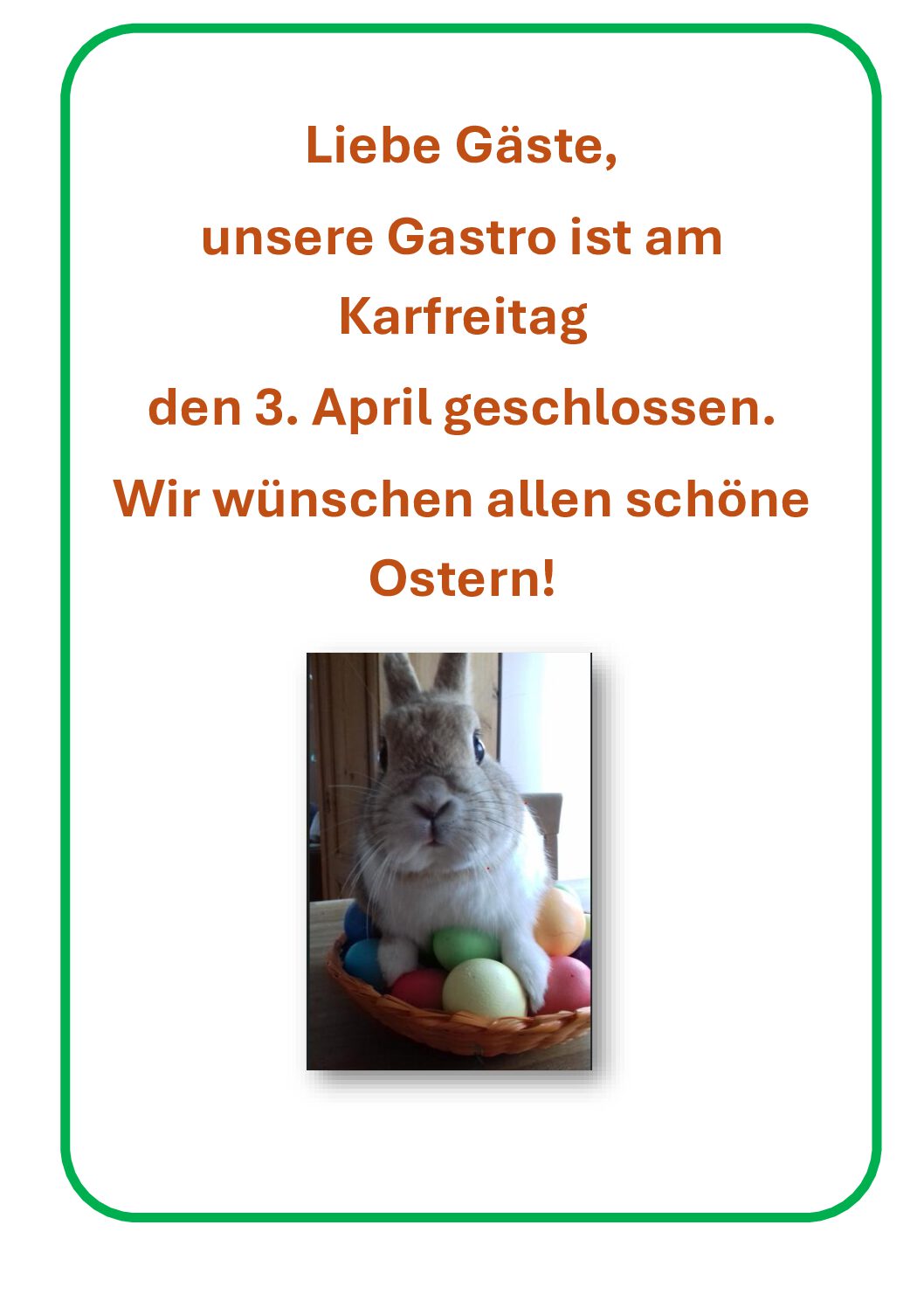 Liebe Mitglieder und Gäste, am Karfreitag, den 3. April 2026 bleibt die Gastro geschlossen. Wir wünschen allen frohe Ostern.